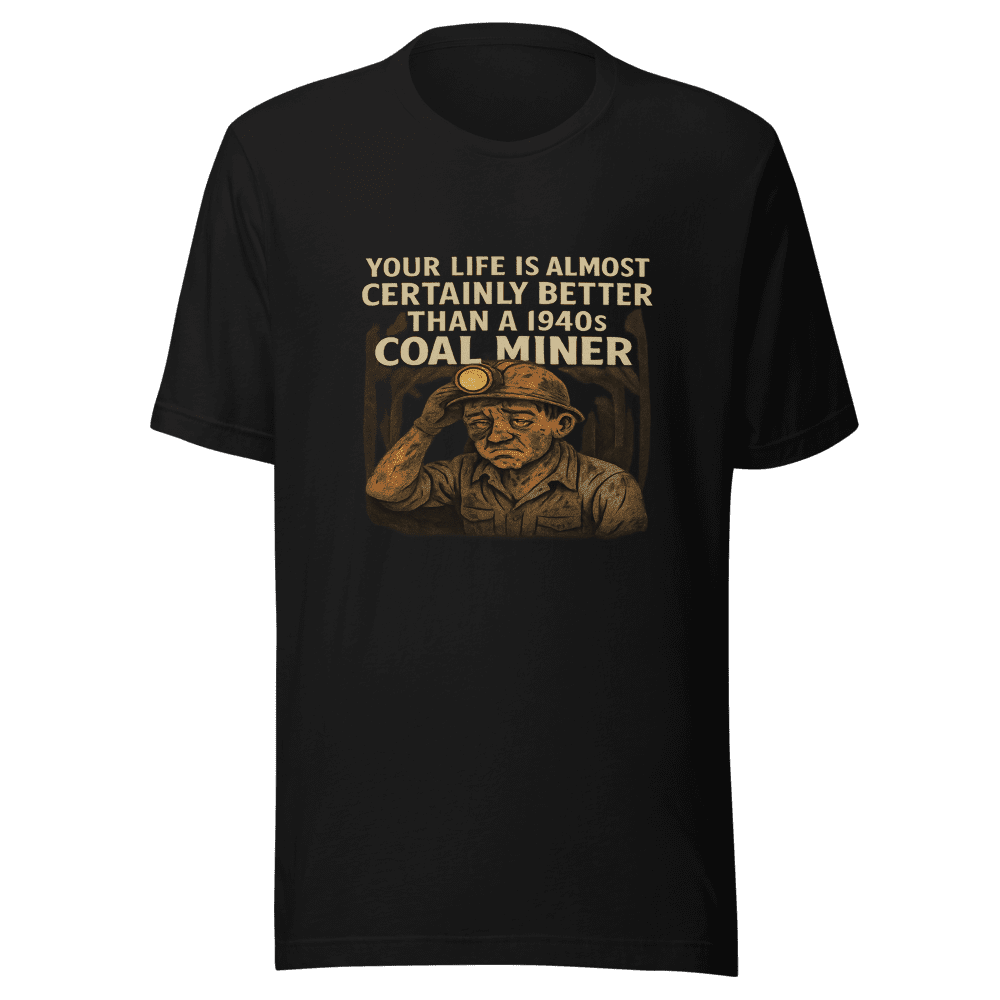 Level up your perspective! You’ve probably seen the viral tweet that’s got everyone talking: Idk who needs to hear this, but your life is almost certainly better than a 1940s coal miner. This tee embodies that hilarious dose of reality. Rock this tee and remind yourself (and everyone else) to appreciate the small wins. This tee isn’t just a statement; it’s a conversation starter. Made with super-soft, breathable fabric, it’s perfect for everyday wear. Sizes are S, M, L, & XL. Wash instructions are normal. Don’t wait, grab yours now and spread the positivity!