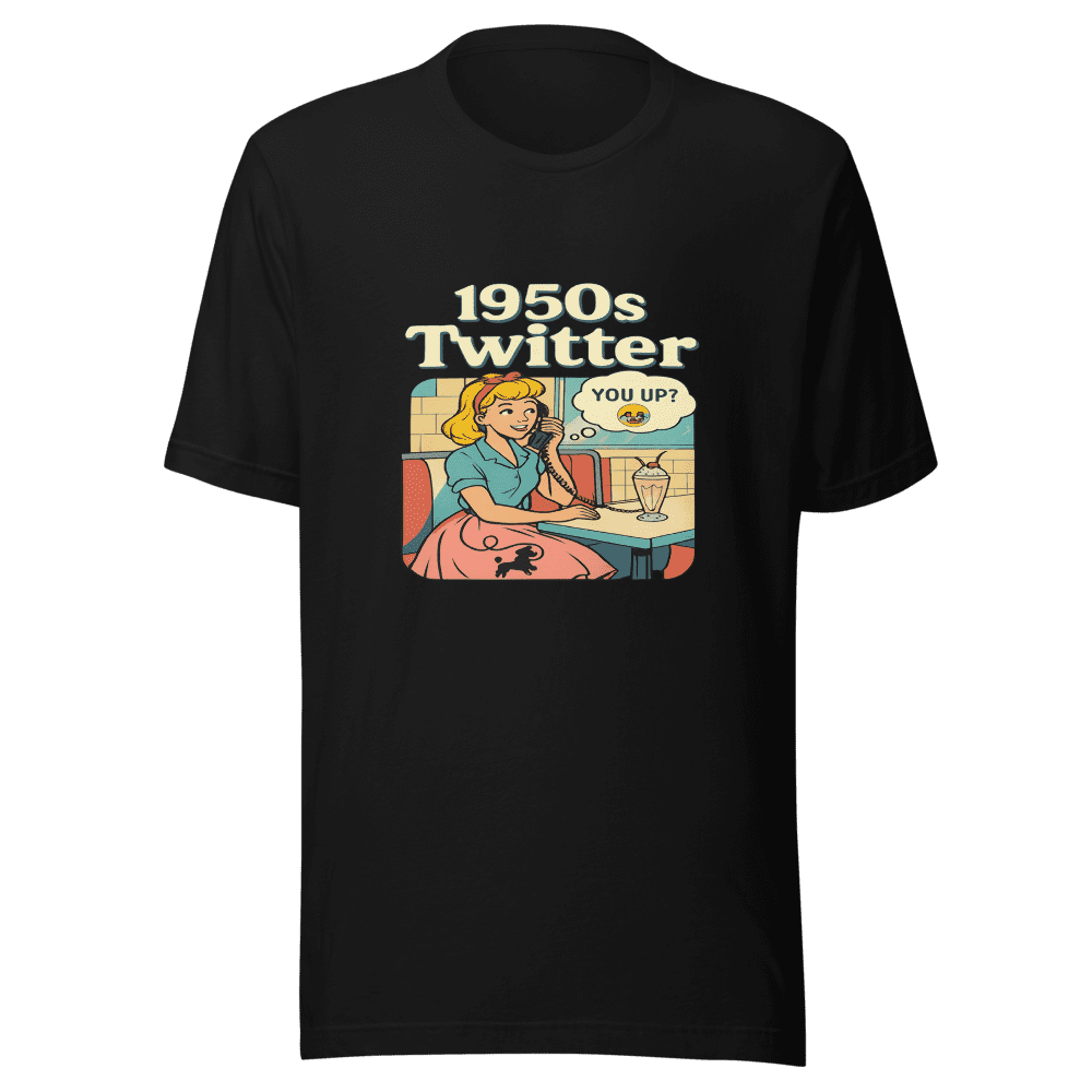 Step back in time with our 1950s Twitter T-Shirt! This hilarious tee imagines what the social media landscape would have looked like in the fifties, complete with vintage slang and old-school charm. Join the viral trend and grab this must-have shirt that’s taking the internet by storm. Don’t miss out on owning a piece of internet history – this tee is guaranteed to spark conversations and turn heads. Perfect for anyone who loves a good laugh and a touch of nostalgia. Makes a great gift for your retro-loving friends or anyone who appreciates a clever meme. Get yours now before they’re gone! Sizes are S,M,L & XL. Wash instructions are normal. Upgrade your wardrobe with this trending tee today!
