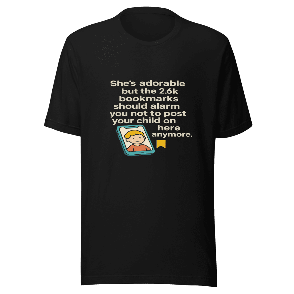 Don’t let the internet steal your joy! This t-shirt captures the essence of the viral tweet that sparked a thousand conversations. You know the one: She’s adorable but the 2.6k bookmarks should alarm you not to post your child on here anymore. It’s a reminder to protect what matters most, with a touch of internet humor. Join the movement and wear this tee as a badge of honor for mindful online sharing. Get yours now before they’re all gone! This shirt is a must-have for anyone who understands the delicate balance between sharing and safeguarding. Sizes are S, M, L & XL. Wash instructions are normal. Grab this viral sensation today and make a statement!