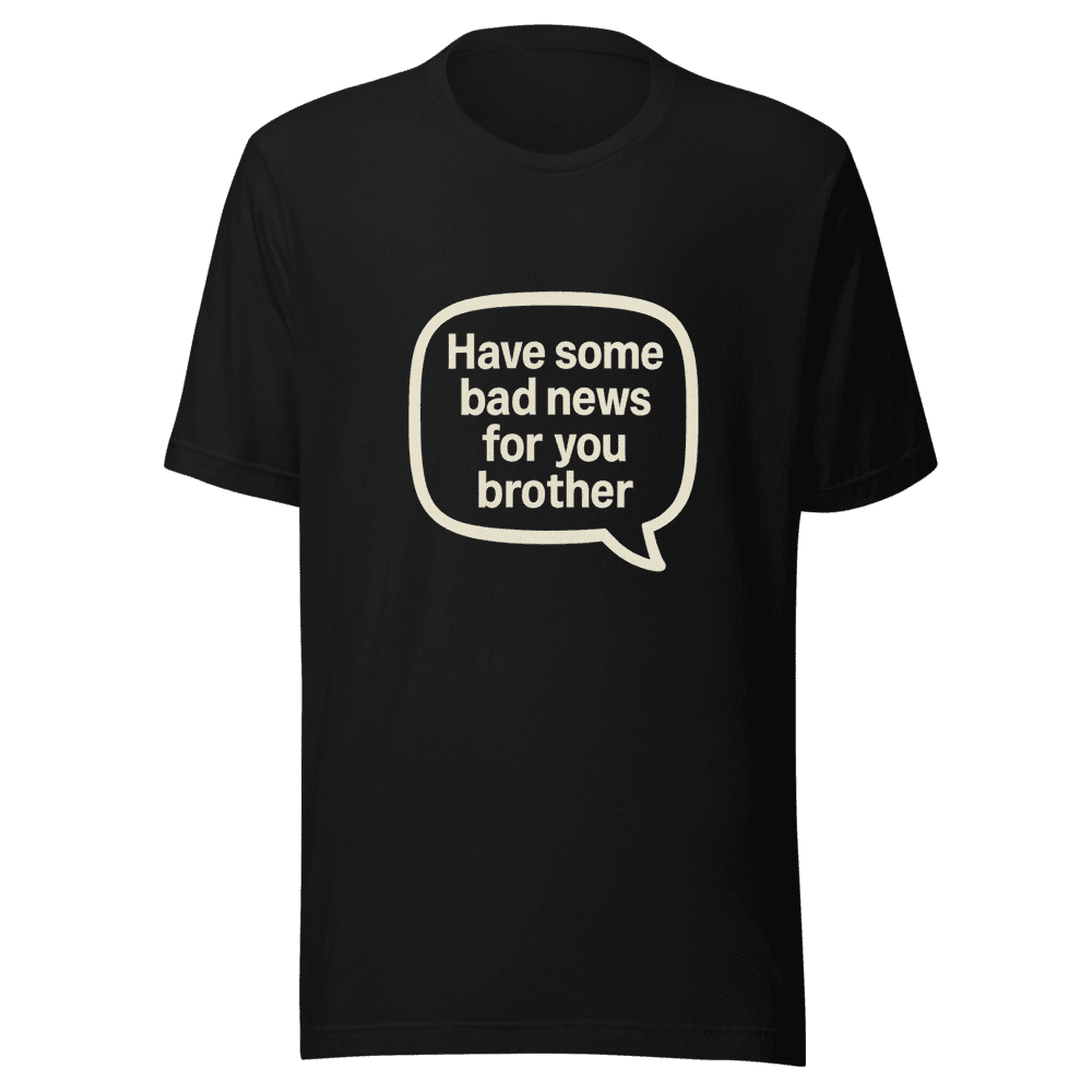 Get ready to drop some truth bombs with this Bad News Meme Tee! This shirt is inspired by a viral social media hit, capturing that relatable feeling when you have some tough news to deliver. Everyone is talking about this trending quote, and now you can wear it. Perfect for expressing your mood with a touch of humor. Made from comfortable, high-quality fabric, this tee is designed for everyday wear. It’s a conversation starter and a statement piece all in one. Available in sizes S, M, L, and XL. Easy to care for, just follow normal wash instructions. Don’t miss out on this must-have tee, grab yours today and let the world know you’ve got news to share! Get yours now before it sells out! This tee is a social media hit!