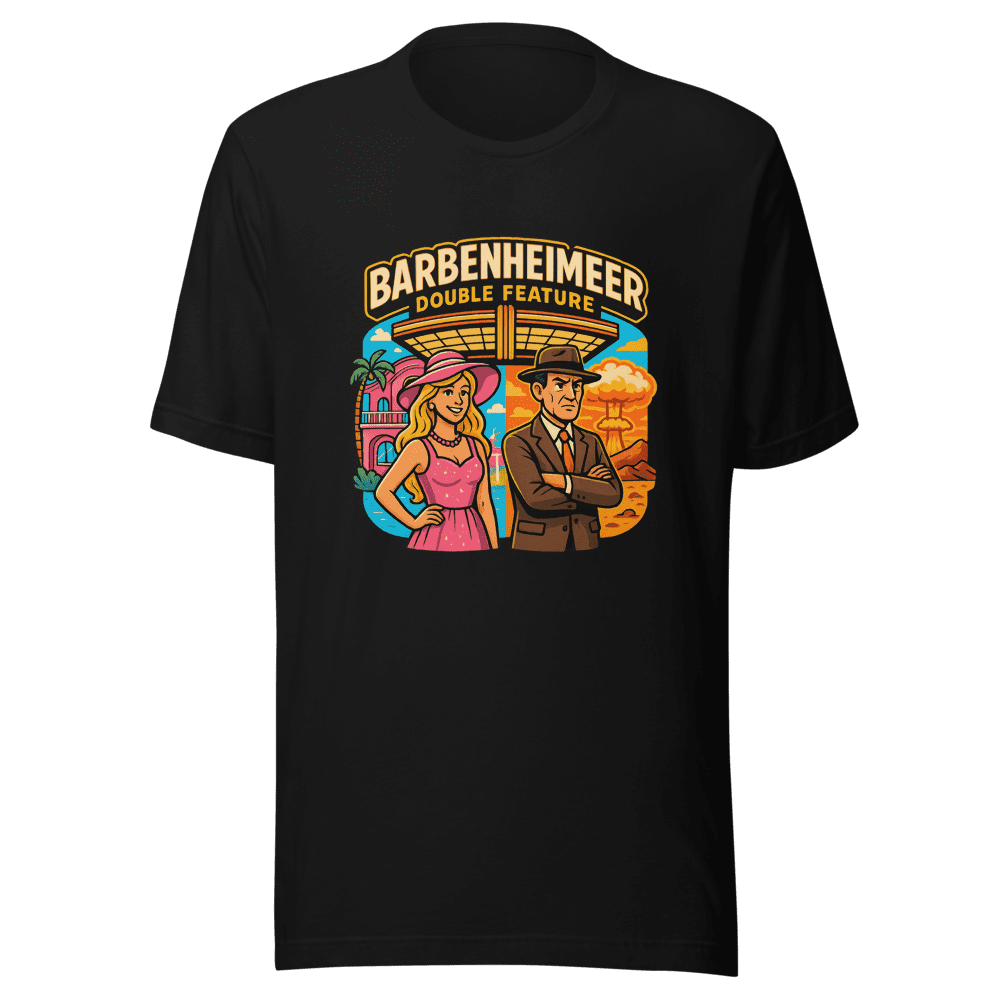 Relive the legendary summer with the Barbenheimer Double Feature Outfit T-Shirt! Remember the viral sensation that swept the internet? This tee perfectly captures the spirit of dressing up and hitting the theater for the ultimate movie marathon. As seen all over social media, this design is a must-have for anyone who experienced the Barbenheimer craze. Show off your love for this iconic cultural moment! This comfy tee is perfect for casual wear, movie nights, or reliving those epic summer vibes. Get yours now before this trend fades away! Sizes available: S, M, L, and XL. Normal wash instructions apply. Grab yours now and show the world you were part of the Barbenheimer phenomenon! Limited stock available.