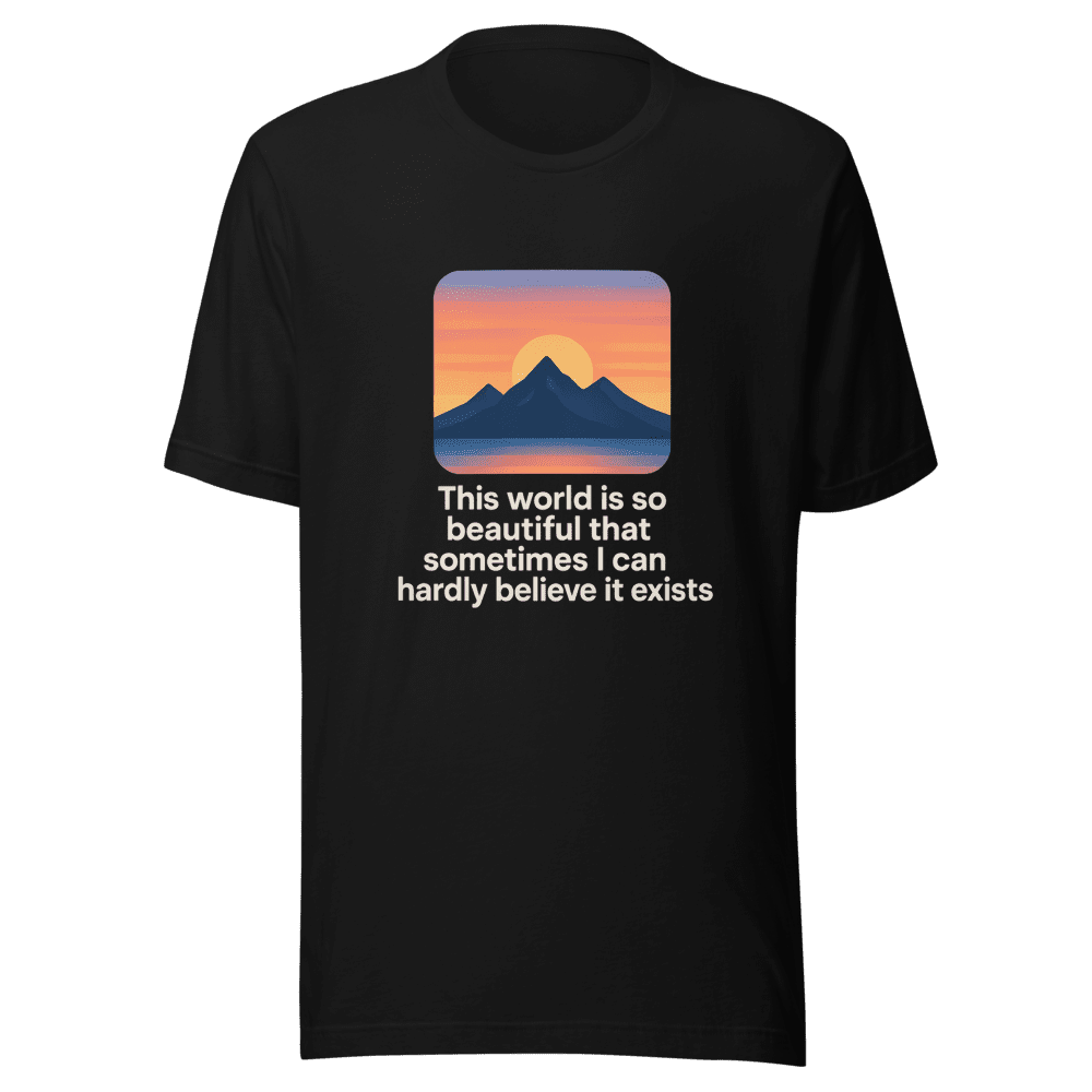 Get ready to wear your wonder! This tee captures a viral tweet that’s been shared across the globe: This world is so beautiful that sometimes I can hardly believe it exists. Join the movement of appreciating the beauty around us with this stunning graphic tee. It’s more than just a shirt; it’s a reminder to stay present and see the magic in everyday moments. Made from soft, breathable cotton, this tee is perfect for everyday wear. Show off your appreciation for beauty and spread positive vibes wherever you go. Don’t miss out – grab yours now and inspire others to see the world with fresh eyes! Sizes are S, M, L & XL. Wash instructions are normal. Add to cart now!