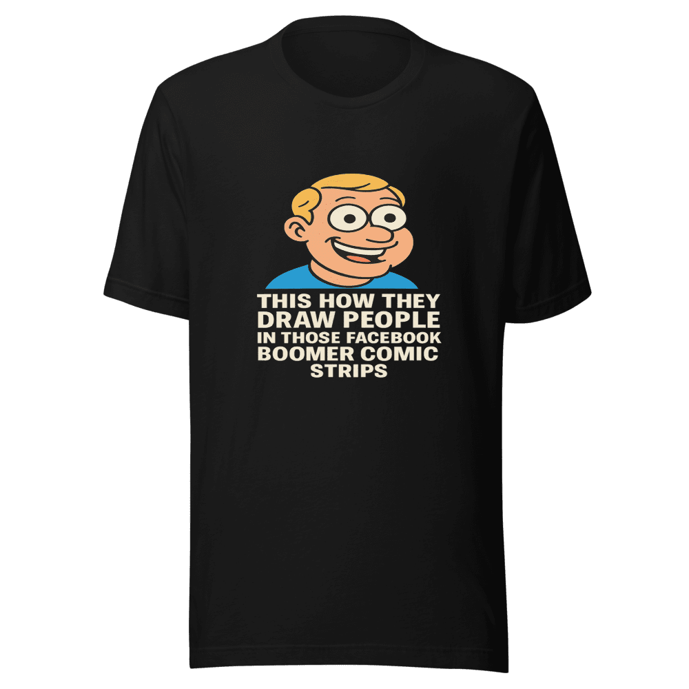You’ve seen the memes, now wear the shirt! This Boomer Comic Strip Meme T-Shirt captures the internet’s hilarious observation about the way people are drawn in those ubiquitous Facebook comic strips. Instantly recognizable and guaranteed to spark conversation, this tee is a must-have for anyone who appreciates internet humor. Join the viral trend and show off your meme knowledge with this comfy and stylish t-shirt. Be the envy of your friends, this shirt is a certified hit, as seen all over social media! Get yours now before they’re all gone, because these are selling out fast! This shirt is available in sizes S, M, L, and XL. To keep your shirt looking its best, just follow the normal wash instructions. Add this iconic piece to your wardrobe today!
