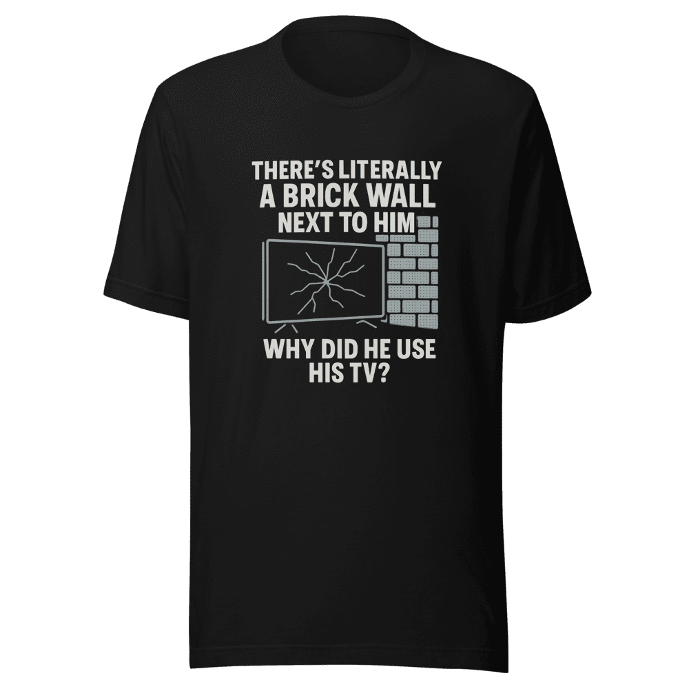 Missed opportunity? This Brick Wall TV Fail Meme T-Shirt captures the internet’s latest obsession! This tee is fire! Trending now and going viral! Be part of the meme magic with this must-have shirt. Why use a TV when a brick wall is right there? This shirt answers all the questions, without answering anything. Get yours before they’re all gone! Show off your meme knowledge and spark conversations wherever you go. Features a comfortable fit and premium quality print. Available in sizes S, M, L, and XL. Normal wash instructions. Don’t be the last to know – grab this viral sensation now and level up your wardrobe!