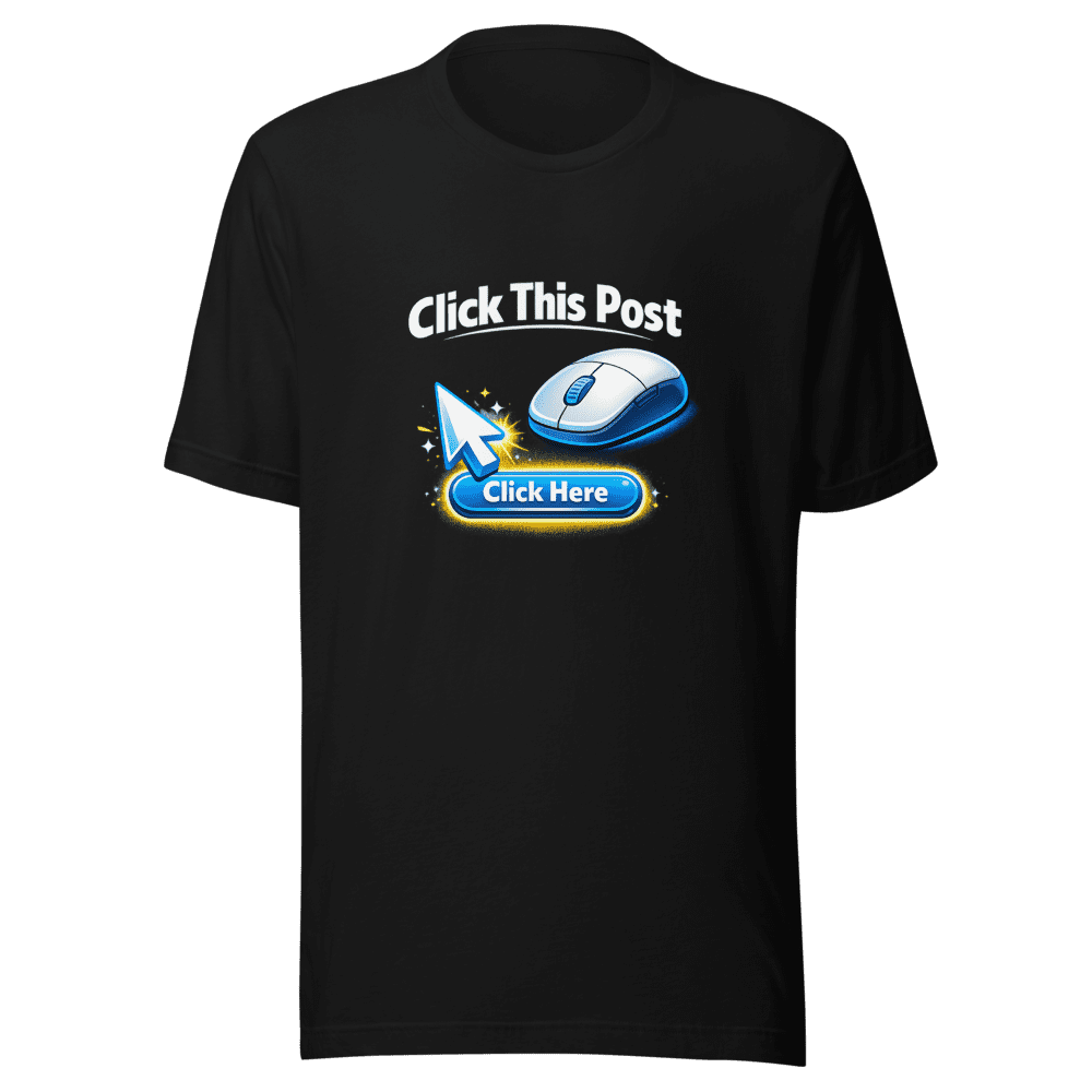 Don’t miss out on the viral sensation! You saw the tweet, now own the shirt. This Click This Post tee embodies the internet’s desperate yet hilarious quest for likes. Join thousands who get the joke and rock this iconic piece of internet culture. Show the world you understand the game with this must-have tee. Soft, comfortable, and guaranteed to turn heads (and maybe even get you some clicks). Get yours now before they’re all gone! Available in sizes S, M, L, and XL. Normal wash instructions. Click add to cart and become a part of the viral sensation!