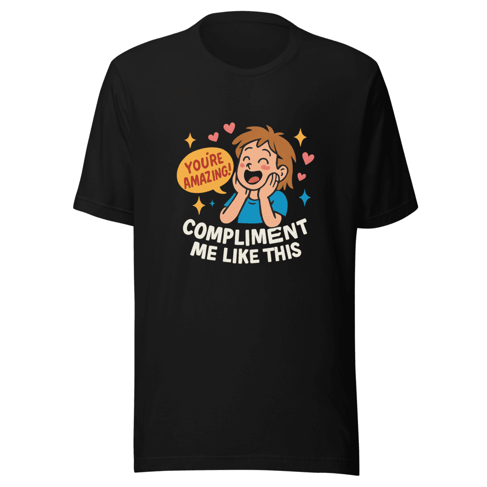 Level up your compliment game with the Compliment Me Like This T-Shirt! This tee is inspired by the viral tweet that took the internet by storm. Everyone wants to be complimented in a way that makes them feel amazing, and this shirt captures that hilarious desire. Be ready to turn heads and spark conversations wherever you go. Join the trend and let the world know you deserve top-tier praise! This tee isn’t just clothing; it’s a statement. Get yours now before the trend fades! This classic fit tee is soft, comfortable, and ready for anything. Sizes available: S, M, L, XL. Wash instructions: normal. Don’t miss out on this must-have piece of internet culture. Grab your Compliment Me Like This T-Shirt today and get ready for the compliments to roll in!
