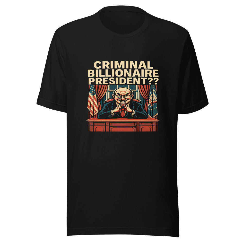 Get this trending Criminal Billionaire President T-shirt before it’s gone! This hilarious tweet has gone viral, sparking conversations and laughs across the internet. Now, you can wear the wit! This t-shirt perfectly captures the zeitgeist of our times, featuring a design that is both thought-provoking and humorous. Show off your sharp sense of humor and stay ahead of the curve with this must-have piece. It’s more than just a t-shirt; it’s a statement. Made from high-quality, comfortable material, this tee is perfect for everyday wear. Available in sizes S, M, L, and XL. To keep your tee looking its best, normal wash instructions apply. Don’t miss out on owning a piece of internet culture – grab yours today and join the viral sensation! Be part of the trend.
