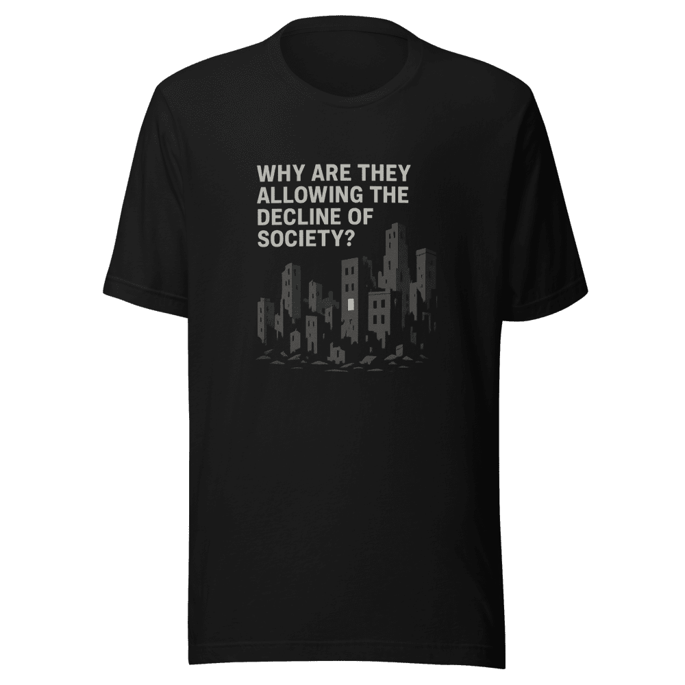 Make a statement with this Decline of Society T-Shirt. Inspired by a viral tweet that sparked conversations everywhere, this tee lets you wear your mind. Join the trend and show where you stand, this is a must-have for anyone who wants to express their views. This T-shirt is more than just apparel; it’s a statement piece that speaks volumes. Perfect for sparking conversations and turning heads, it’s designed for those who aren’t afraid to express themselves. Don’t miss out on owning a piece of internet culture. Get yours now and be part of the movement. These shirts are available in sizes S, M, L, and XL. Wash instructions are normal.