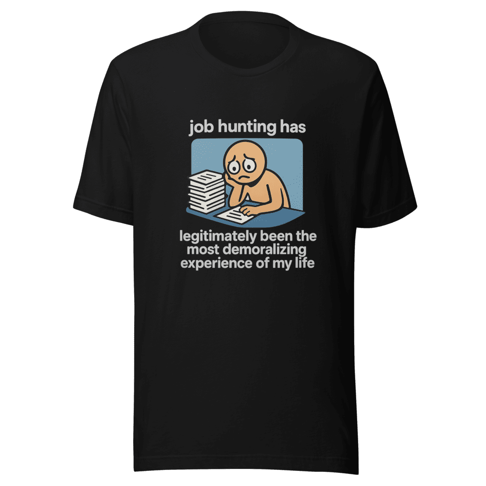 Join the club! This Demoralizing Job Hunt Club T-shirt perfectly captures the soul-crushing experience of modern job searching. Seen all over Twitter, this design resonates with anyone who’s ever felt lost in the endless application abyss. Why suffer in silence? Wear your job hunt woes with pride (and maybe a touch of humor). This isn’t just a t-shirt; it’s a badge of honor for surviving the gauntlet. Show the world you understand the struggle is real. Grab yours now before the algorithm changes and this meme fades away! This viral tee is the perfect conversation starter (or icebreaker for your next networking event…ironically). Sizes are S,M,L & XL. Wash instructions are normal. Don’t wait, order yours today and let the world know you get it!