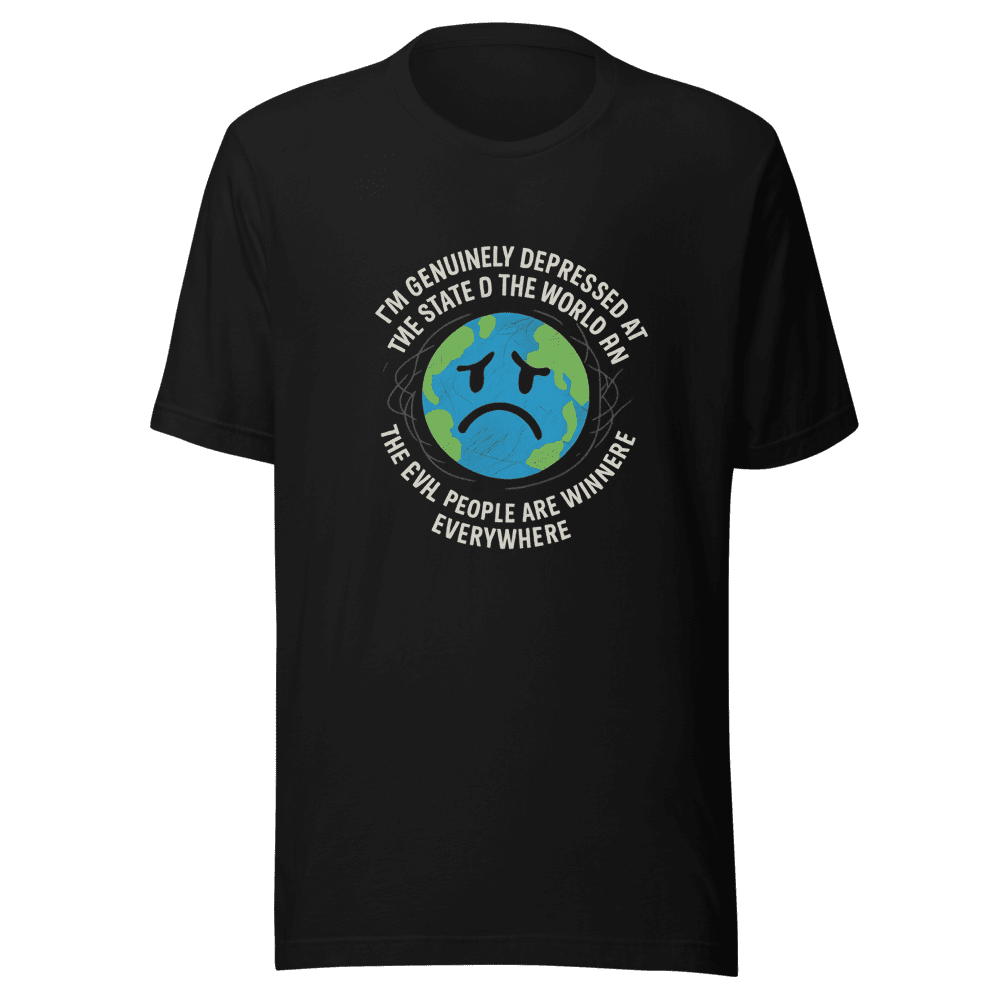 Feeling down about the world? You’re not alone. This tee perfectly captures the mood of millions who are feeling the weight of current events. Inspired by a viral tweet that resonated across social media, this Depressed State of the World Tee is your way to express yourself and connect with others who understand. Join the conversation and show you’re not giving up hope. Made from soft, breathable cotton, this tee is as comfortable as it is meaningful. Perfect for everyday wear, protests, or just chilling with friends. This is more than just a shirt; it’s a statement. A reminder that we’re all in this together. Sizes available are S, M, L, and XL. Wash instructions are normal. Grab yours now before they’re gone! Let’s turn shared feelings into positive change, one tee at a time. Get yours today.