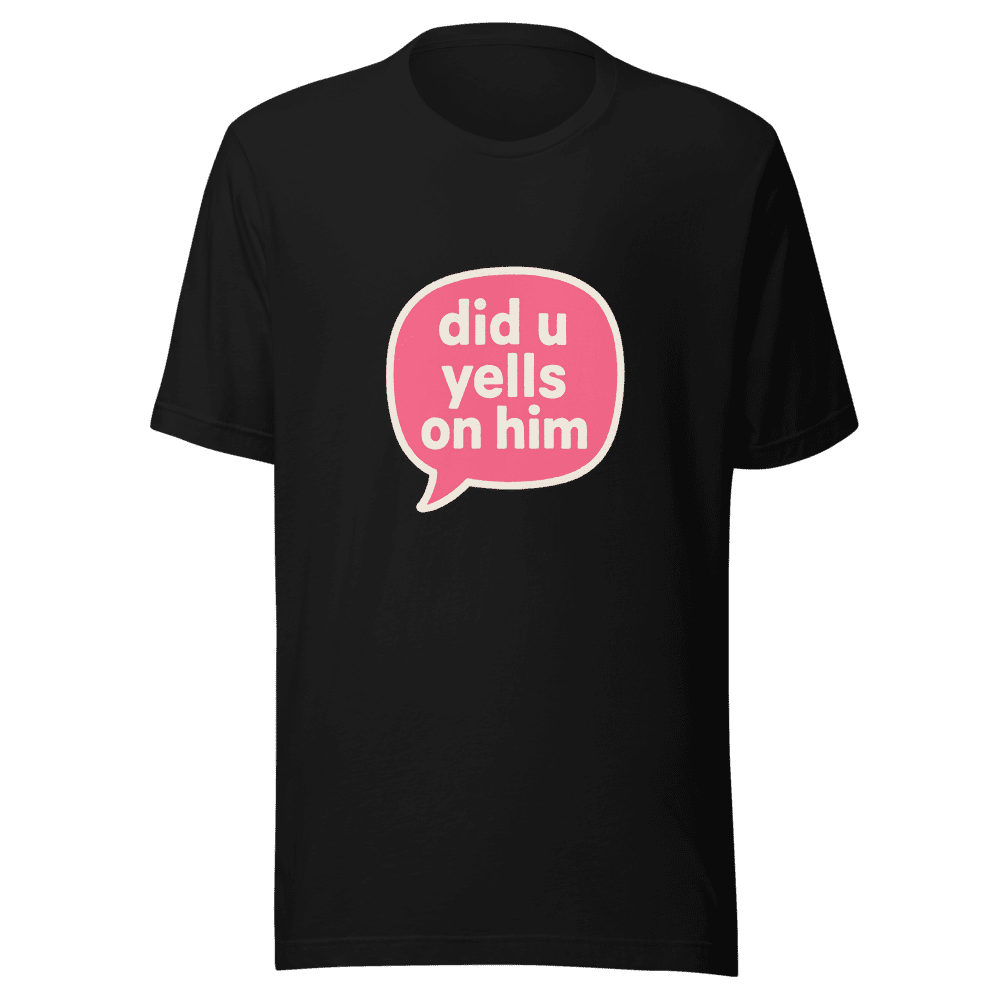 The internet can’t stop laughing! This Did U Yells On Him tee is going viral and you need to grab yours NOW! Don’t miss out on owning a piece of internet history. This t-shirt perfectly captures the chaotic energy of the original meme. Comfortable and stylish, this shirt is perfect for expressing your online humor in the real world. Show off your meme knowledge and spark conversations wherever you go. Be part of the inside joke that everyone’s talking about. Get yours before they’re all gone! This tee comes in sizes S, M, L, and XL. Wash instructions are normal. Order now and become a certified meme lord!