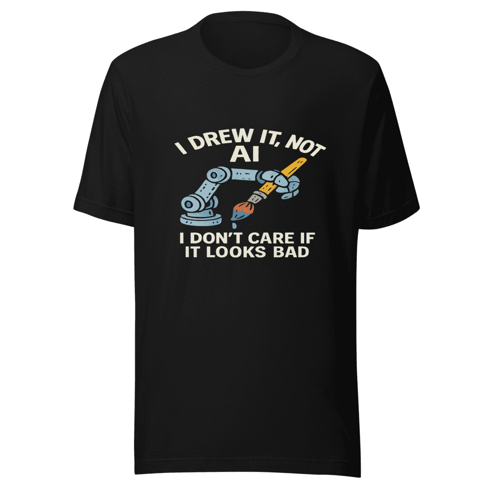 Stand out from the crowd with the Drew It Not AI Tee. This design embodies the spirit of authentic human creativity, a defiant statement against the AI art takeover. This tee went viral, resonating with artists and art lovers everywhere who champion genuine expression over algorithm-generated perfection. Be part of the movement. It’s more than just a shirt; it’s a badge of honor for those who believe in the power of human creation. Show your support for real art with this eye-catching design. This tee is comfortable and durable, perfect for everyday wear. Sizes available are S, M, L, and XL. Wash instructions are normal. Grab yours now and let the world know where you stand.