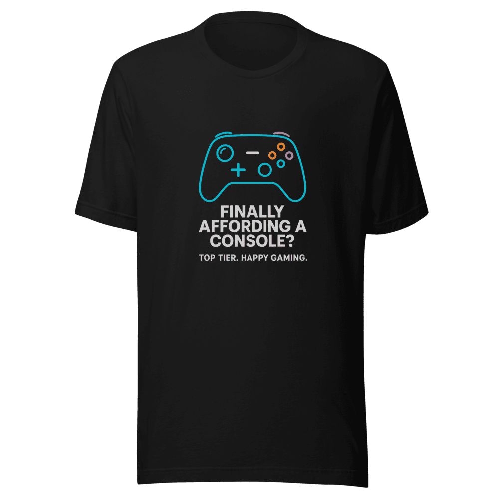 Finally upgraded your setup? Level up your wardrobe too with this premium tee! Inspired by the viral tweet that resonated with gamers everywhere, this shirt celebrates that feeling of finally affording a console. Join thousands who are rocking this tee and showing off their love for gaming. Experience ultimate comfort with our soft, breathable fabric. Perfect for long gaming sessions or casual wear. Available in sizes S, M, L, and XL. Easy to care for: normal wash instructions. Don’t miss out, grab yours today and let the world know you’re top tier! This tee combines style and comfort with a message that speaks to every gamer’s heart. Get yours now and celebrate your gaming achievements in style.