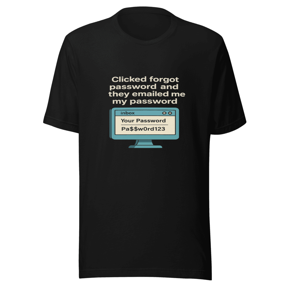 Act fast and grab this viral sensation tee before it’s gone! This t-shirt embodies the hilarious absurdity of online security, perfectly capturing the moment when you clicked forgot password only to be emailed your password plain as day. This design is inspired by the viral tweet that took the internet by storm, resonating with millions who have experienced this digital paradox. Be part of the trend and wear your tech frustration with pride. Made from comfortable, high-quality material, this t-shirt is perfect for everyday wear and guaranteed to spark conversations. Sizes available are S, M, L, and XL. Normal wash instructions apply. Don’t miss out on owning a piece of internet culture. Add to cart now and show the world you get the joke!