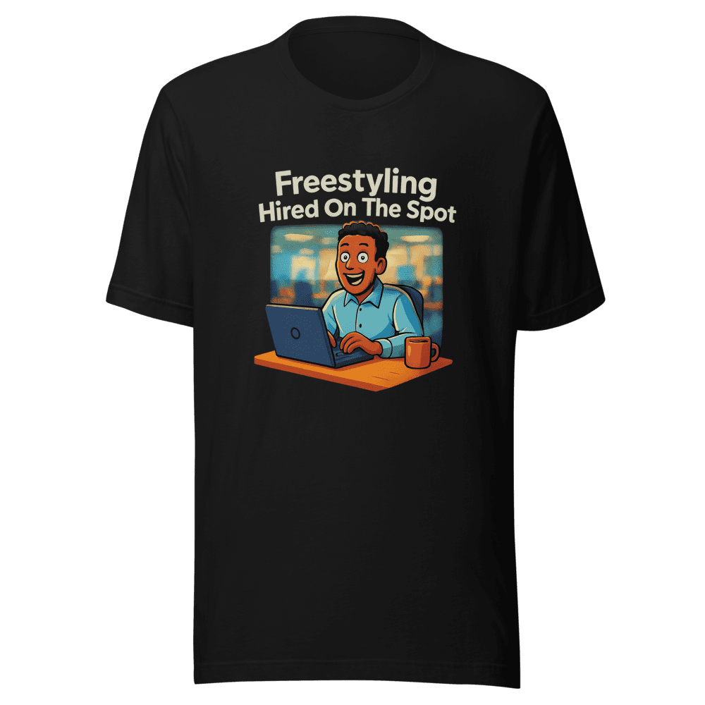 Land Your Dream Job (Maybe)! This tee celebrates those moments when you just wing it and somehow, magically, succeed. Inspired by the viral tweet that took over the internet, this shirt embodies the chaotic energy of getting hired on the spot and feeling like a total boss. Join the movement of people who aren’t afraid to fake it till they make it – or at least look good trying. Snag this tee and let the world know you’re ready to freestyle your way to success. Don’t wait, everyone’s talking about it! This tee won’t last long! Get yours now and become part of the internet sensation. Available in sizes S, M, L, and XL. Wash instructions are normal. Get yours now!