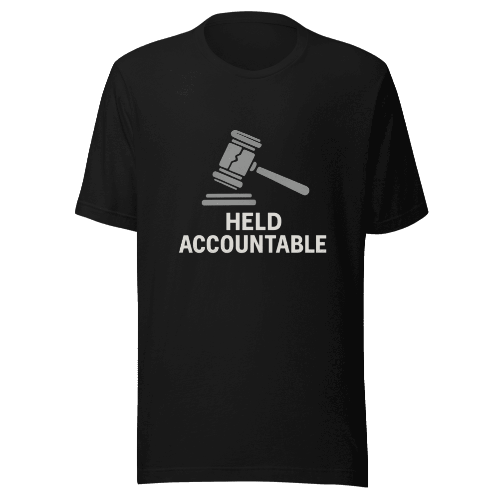 Grab this must-have Held Accountable T-shirt and make a statement! Inspired by a viral tweet that sparked conversations everywhere, this tee embodies the sentiment of responsibility and consequences. Join the trend and wear your beliefs with pride. This tee isn’t just clothing; it’s a conversation starter, a symbol of accountability, and a way to express your views. With its comfortable fit and eye-catching design, you’ll want to wear it everywhere. Don’t miss out – this shirt is selling fast! Get yours now and be part of the movement. Available in sizes S, M, L, and XL. Wash instructions are normal. Order now and let your voice be heard!
