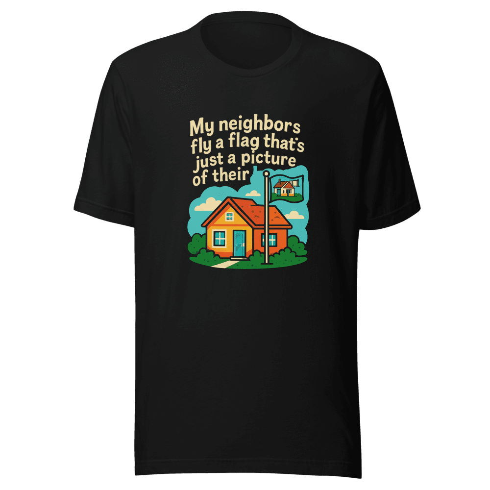 Get ready to turn heads with the House Flag Tweet T-Shirt! Inspired by the viral tweet that took the internet by storm, this tee perfectly captures the humor of suburban life. Imagine your neighbor flying a flag that’s literally just a picture of their house. That’s the kind of quirky brilliance this shirt celebrates! Made with super-soft cotton, this tee is as comfy as it is hilarious. It’s perfect for casual outings, meme enthusiasts, or anyone who appreciates a good laugh. Join the viral sensation and show off your sense of humor with this must-have tee. Sizes available: S, M, L, XL. Wash instructions: Normal. Grab yours now before they’re all gone! Be part of the trend.