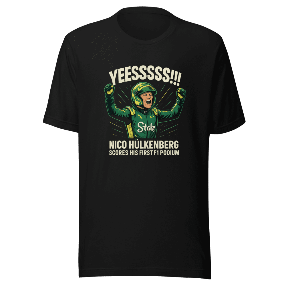 Witness History! Get your hands on this limited-edition Hulkenberg Podium Finish T-Shirt and celebrate a legendary moment in Formula 1! This iconic tweet went viral, capturing the sheer joy of Nico Hulkenberg finally achieving his first F1 podium in his 239th race. Join the celebration and show your support for this incredible driver with this must-have tee. Featuring a vibrant design, this shirt is the perfect way to express your passion for racing and commemorate this historic achievement. Don’t miss out – grab yours before they’re gone! Available in sizes S, M, L, and XL. Normal wash instructions. Add this awesome tee to your wardrobe today!
