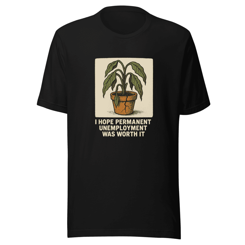 Is that career change looking a little bleak? Join the club! This tee embodies the sentiment of that viral tweet everyone’s talking about. You know the one: I hope permanent unemployment was worth it. Own the irony and make a statement with this super-soft, comfy tee. It’s the perfect conversation starter, whether you’re actually unemployed or just dreaming of a career change. But don’t wait, this tee is trending and selling fast! Grab yours before everyone else does! Sizes are S, M, L & XL. Wash instructions are normal. Get yours today and show the world you’re in on the joke.