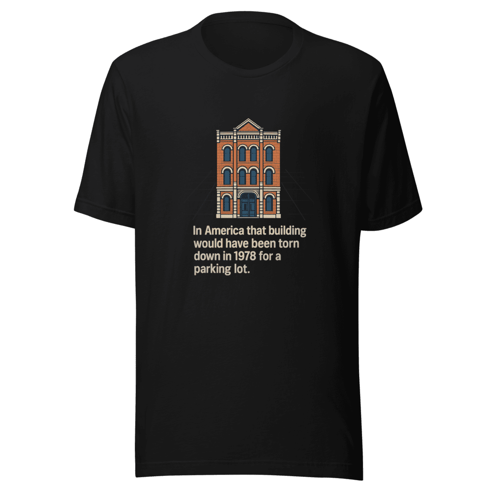 Stop! Don’t let this be another parking lot! This tee captures the internet’s outrage and love for preserving architectural gems, inspired by a viral tweet that resonated with millions. Join the movement to save our cities’ character, one building at a time. This shirt isn’t just clothing; it’s a statement. A conversation starter. A way to show you care about urban spaces and historical preservation. Get yours now and be part of the viral trend! Imagine the compliments and knowing nods you’ll get from fellow architecture enthusiasts. Don’t miss out! Available sizes are S,M,L & XL. Normal wash instructions. Grab yours before they’re gone!