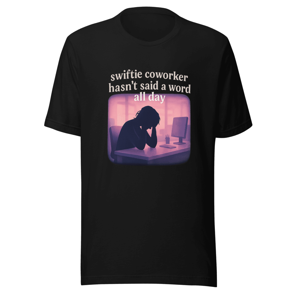 Is your coworker a Swiftie? Did something happen with Taylor? Get this exclusive tee celebrating the ultimate fan experience. As seen in a viral tweet, this shirt perfectly captures that feeling when Taylor drops a new album or has some kind of news. Be the first to rep this iconic moment with our Swiftie Coworker Silent All Day Tee. Let the world know you understand the Swiftie struggle. This tee is more than just apparel; its a badge of honor. Join the thousands who have already shared and loved this tee. Perfect for casual wear, Swiftie meetups, or just showing off your fandom pride. Sizes available: S, M, L, XL. Easy wash instructions: Normal. Get yours now before they are gone!