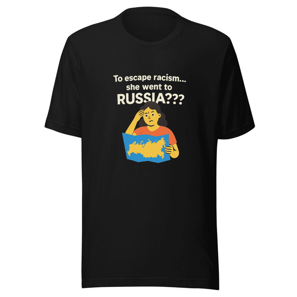 Heard about the viral tweet that’s got everyone talking? To escape racism…she went to RUSSIA??? This tee captures that iconic moment of disbelief and irony! Be part of the trend. This design is a conversation starter, a statement piece, and a must-have for anyone who loves internet culture and social commentary. Show off your wit and stay ahead of the curve with this limited-edition tee. Join the thousands who’ve already shared and loved this design. Get yours now before it’s gone! This exclusive t-shirt embodies the essence of the internet age and is designed for comfort and style. Perfect for everyday wear, parties, or making a statement. Available in sizes S, M, L, and XL. Normal wash instructions. Don’t miss out – grab yours today and be part of the viral sensation!