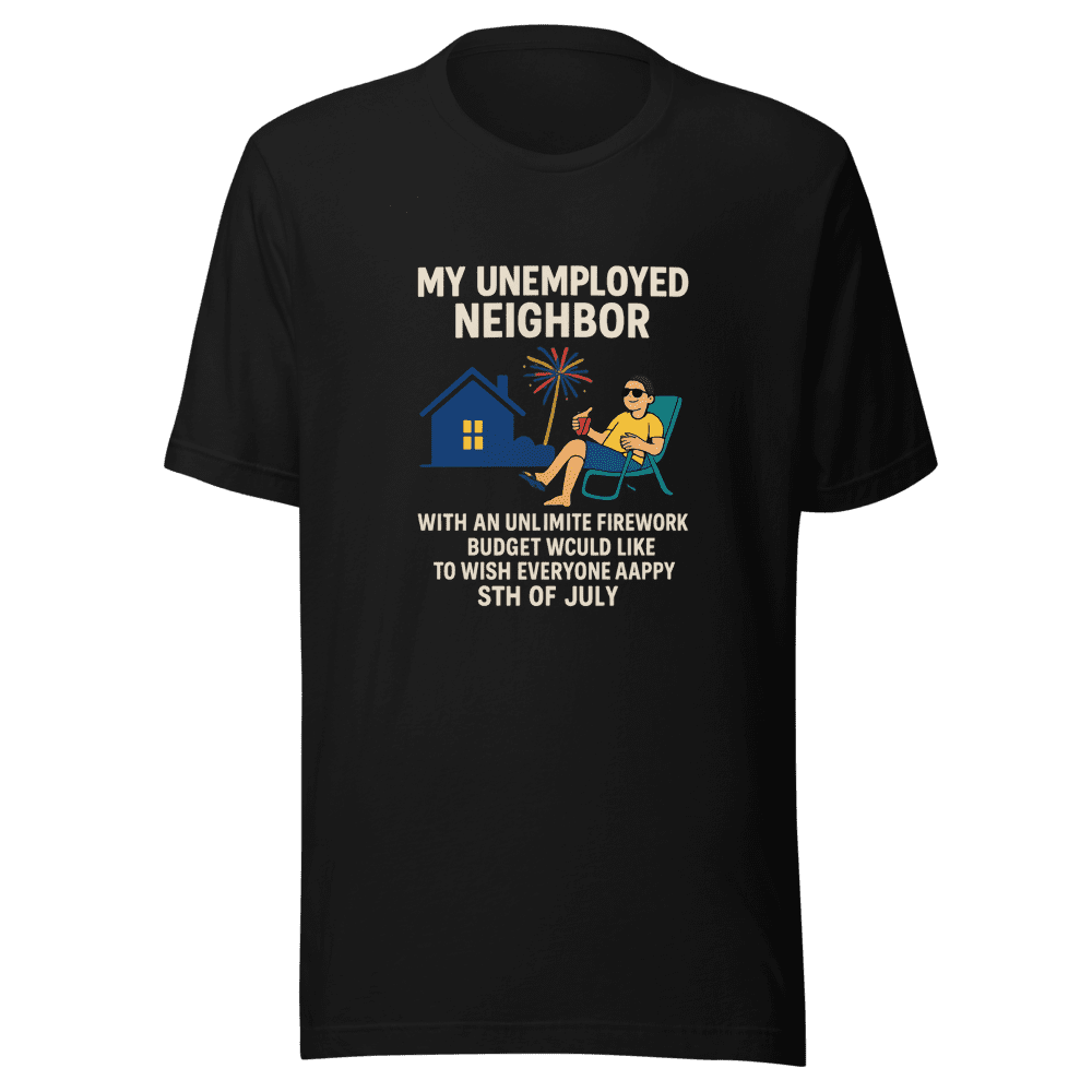 Get your hands on the viral Unemployed Neighbor Fireworks Budget tee that everyone is talking about! This hilarious tee captures the essence of that one neighbor who seems to have it all figured out, even if they don’t have a job. As seen all over the internet, this tee is guaranteed to get laughs and start conversations. Don’t miss out on owning a piece of internet history. Made with high-quality materials for maximum comfort and durability. Features a classic fit that’s perfect for everyday wear. Available in sizes S, M, L, and XL. Wash instructions are normal. Grab yours now before they’re gone! Join the trend and show off your sense of humor with this must-have tee.
