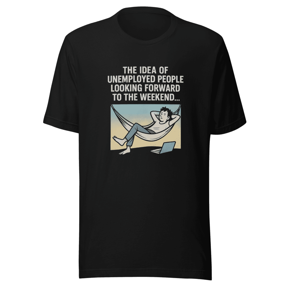 Feeling that sweet, sweet weekend vibe even without a 9-to-5? This tee gets it. Inspired by the viral tweet that had everyone LOL-ing, this shirt is a badge of honor for anyone embracing the unemployed life. Why should the working stiffs have all the fun? You’ve earned your chill time, so rock this tee and let the world know you’re living your best life, one weekend at a time. Join the viral trend and show off your sense of humor with this must-have tee. It’s more than just a shirt; it’s a statement. Available in sizes S, M, L, and XL. Easy wash instructions: normal. Get yours now before everyone else does and be the envy of all your friends. This tee is selling fast – don’t miss out!