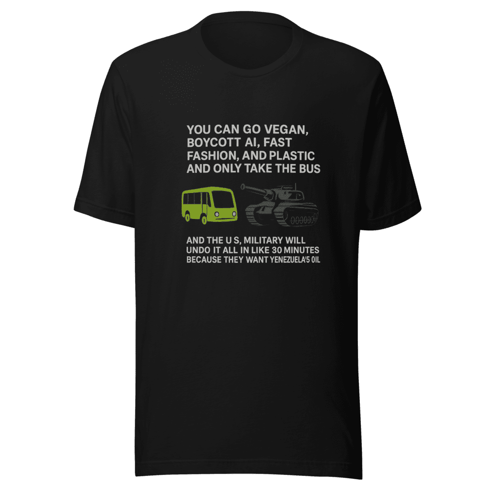 Stop doomscrolling and start repping the real truth with this must-have tee! This shirt captures the essence of that viral tweet everyone’s been talking about: you can go vegan, boycott everything, and ride the bus forever, but certain forces might just undo it all for oil. Join the conversation and make a statement! This isn’t just a t-shirt; it’s a wearable meme that speaks volumes about modern times. Show off your awareness and sense of humor with this trendy design. Get yours now before everyone else does! Sizes are S, M, L & XL. Wash instructions are normal. Add to cart and spark conversations wherever you go!