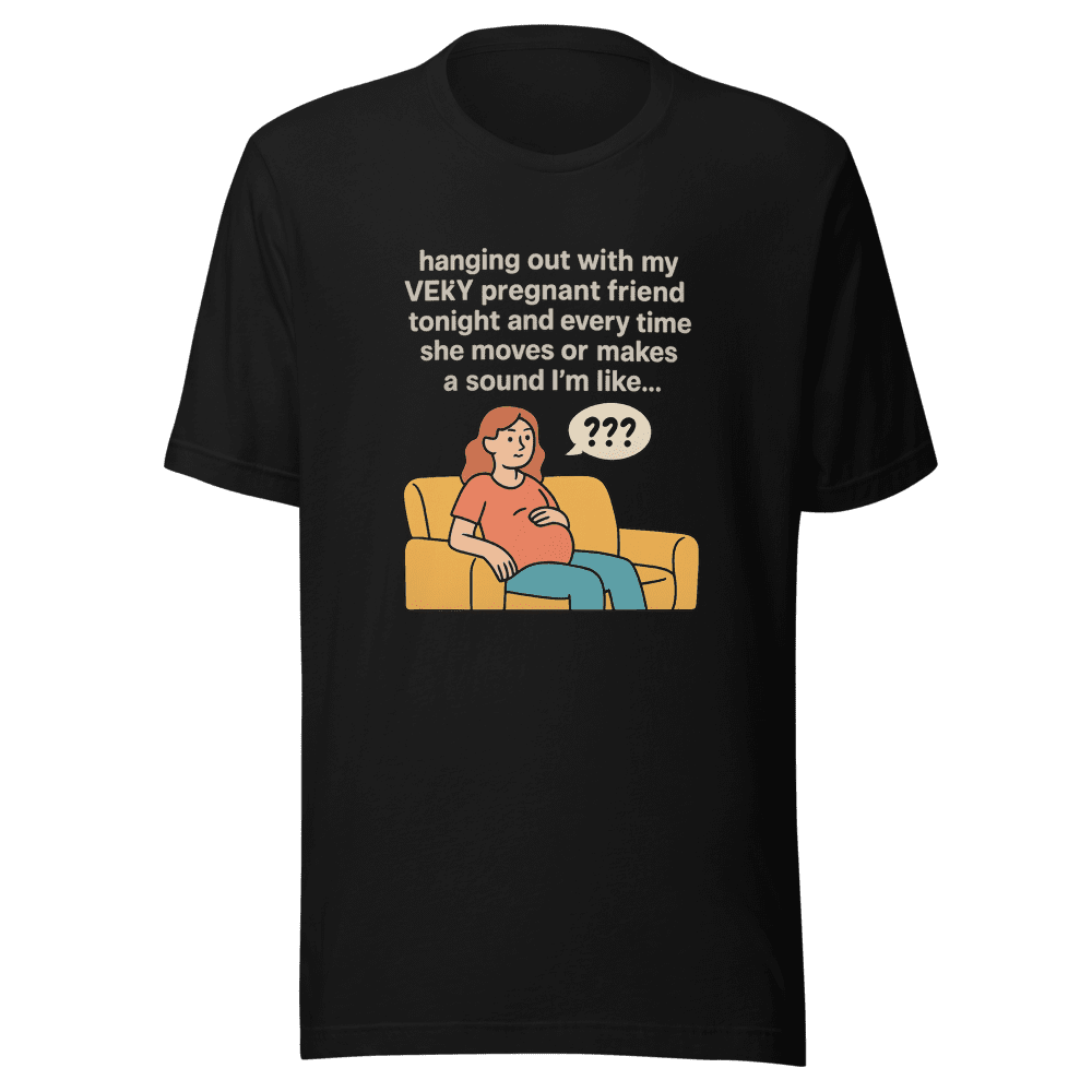 Get ready to laugh with our Very Pregnant Friend Funny T-Shirt! This hilarious tee captures that relatable feeling everyone experiences when hanging out with a pregnant friend. Seen it on Twitter? This design went viral, and now you can wear the joke! Imagine the knowing smiles and instant connections you’ll make sporting this tee. It’s more than just a shirt; it’s a conversation starter. Made from super-soft cotton, this tee is comfy enough for everyday wear. Perfect for casual outings, lounging at home, or gifting to your favorite mom-to-be. Sizes available: S, M, L, and XL. Wash instructions are normal. Don’t miss out on the fun – grab yours today and show off your sense of humor! Be part of the viral sensation. Limited stock available, so order now and let the good times roll!