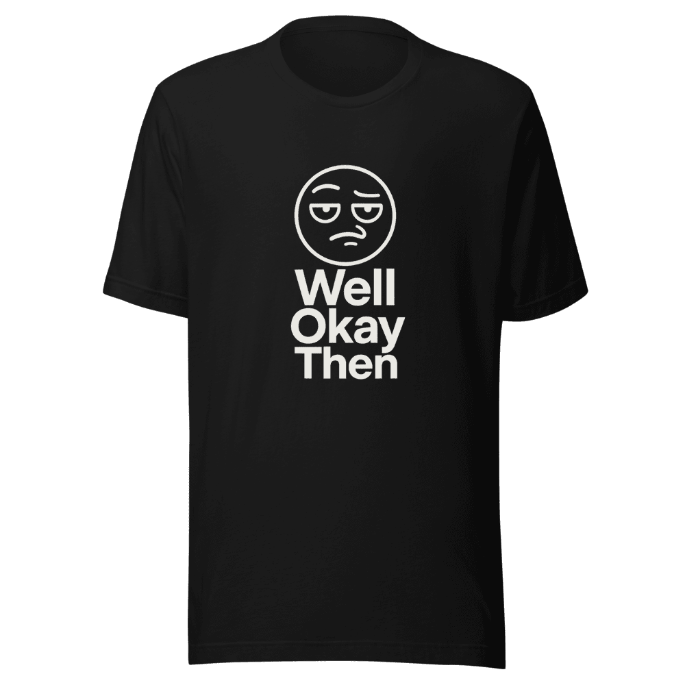 Grab this Well Okay Then T-shirt and show off your internet savvy! This tee captures the essence of that perfect moment when words just aren’t enough. Seen everywhere online, this viral phrase has taken over social media, and now you can wear it. Join the trend and let everyone know you re in on the joke. This tee isn’t just a piece of clothing; it’s a conversation starter, a statement, and a way to connect with fellow meme enthusiasts. Made from comfy, breathable cotton, it’s perfect for everyday wear. Available in sizes S, M, L, and XL. Normal wash instructions apply. Don’t miss out on owning a piece of internet culture – get your Well Okay Then tee today and let your shirt do the talking! This is a must-have addition to your wardrobe.