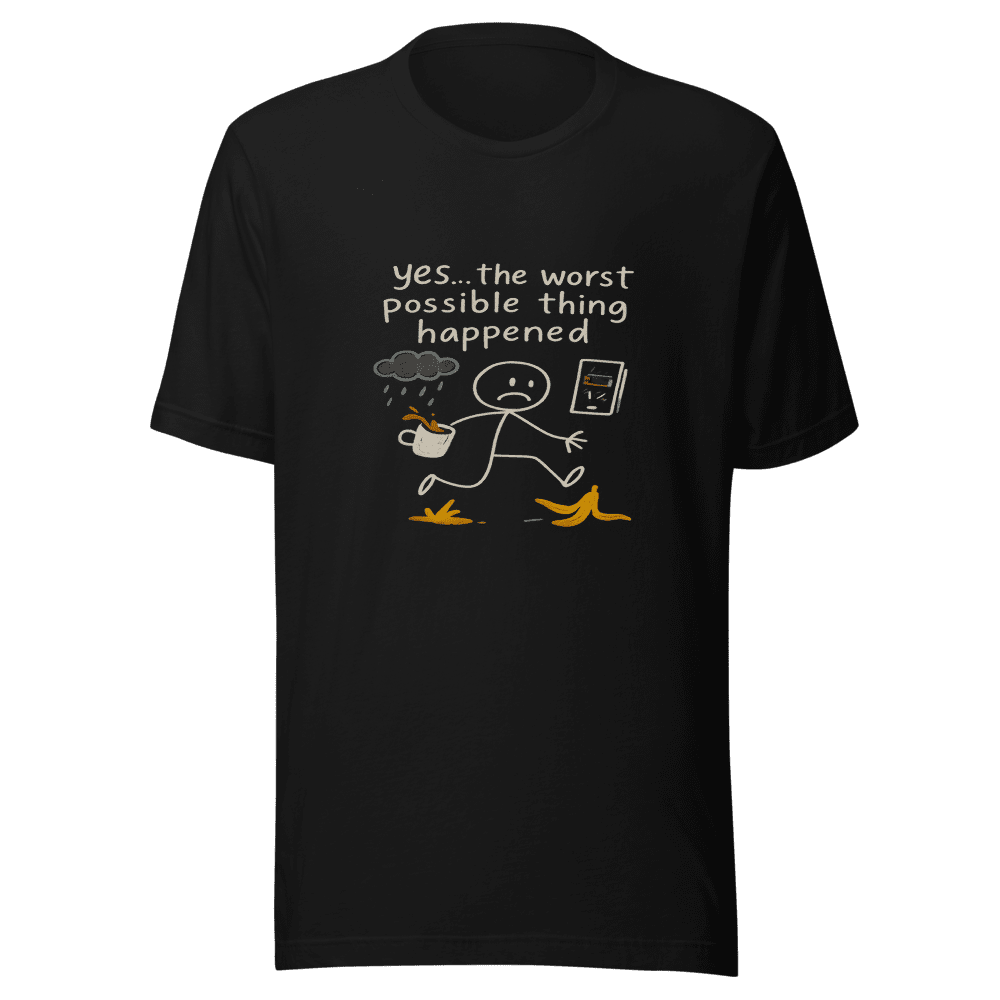 The worst really did happen… but at least you can wear it with pride! This t-shirt is based on the viral tweet that perfectly captures the feeling of everything going wrong. You know the feeling. Everyone knows the feeling! Be part of the trend and show the world you get it. This tee is not just clothing; it’s a conversation starter, a meme come to life, and a testament to the shared human experience of things going sideways. Get yours before the next worst possible thing happens, and look great while it does! Sizes are S, M, L & XL. Wash instructions are normal. Grab yours now and wear your relatable reality!