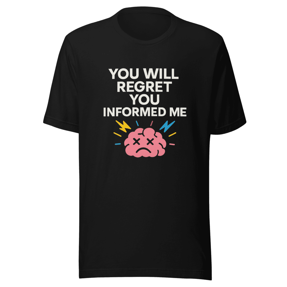 Stop doomscrolling and start repping the internet’s hottest take! This You Will Regret You Informed Me tee is going viral for its hilarious truth – we’ve all been there. Why sugarcoat it when you can wear your frustration with pride? Snag this must-have tee and become part of the meme movement. Perfect for expressing your inner feelings or just sparking conversation, this t-shirt is a whole mood. Get yours before everyone else does! Features a comfortable fit and a bold design that stands out in any crowd. Show off your unique sense of humor and let the world know you’re not afraid to speak your mind. Sizes available: S, M, L, XL. Easy wash instructions: normal. Don’t miss out – add this iconic tee to your wardrobe today! Express yourself.