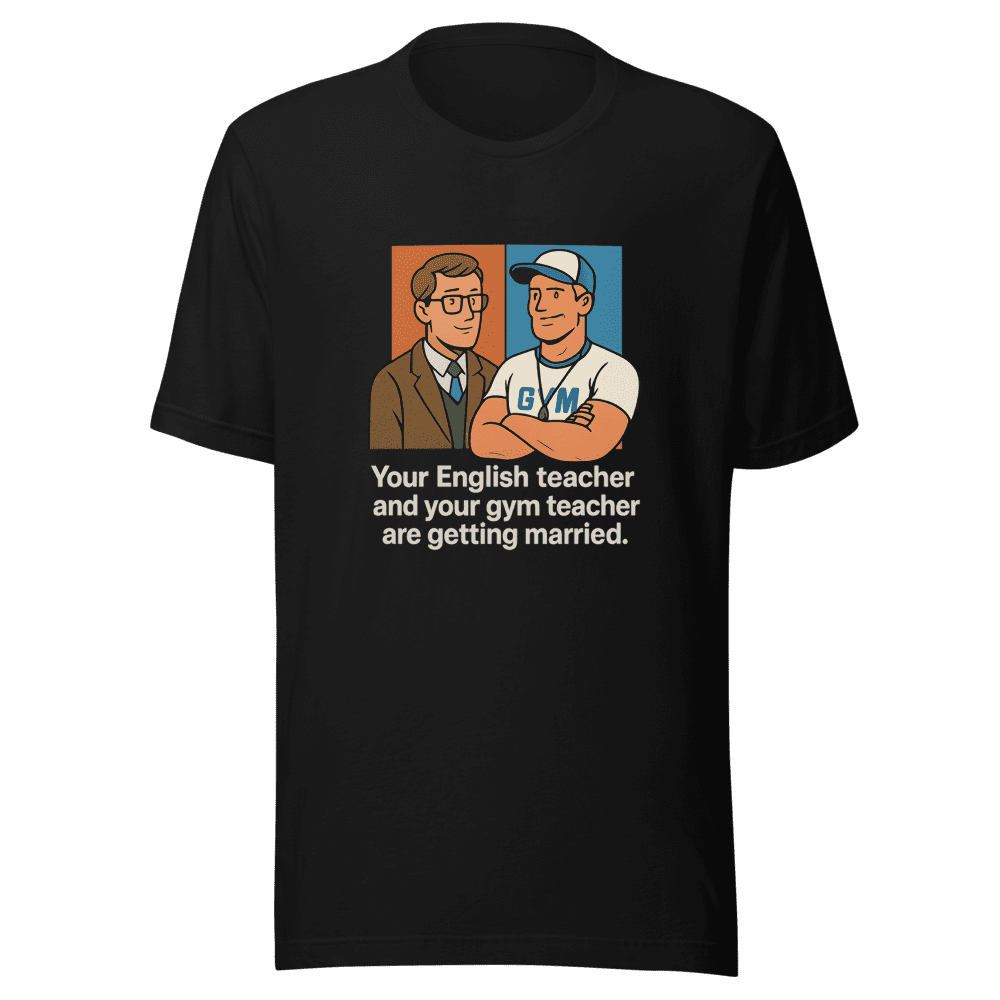 Get ready to celebrate the most unexpected power couple of the year with this viral sensation tee! As seen on PopBase and taking the internet by storm, this shirt perfectly captures the humor of Taylor Swift and Travis Kelce’s supposed engagement. The tweet, Your English teacher and your gym teacher are getting married, has resonated with millions, and now you can wear the meme. Be the first of your friend group to rock this hilarious tee and watch the heads turn. This is more than just a shirt; it’s a conversation starter, a statement piece, and a nod to the pop culture moment everyone’s talking about. Join the trend and show your love for this unlikely pairing. Sizes available: S, M, L, and XL. Easy wash instructions for normal wear. Don’t miss out on owning a piece of internet history – grab yours now before it’s gone!
